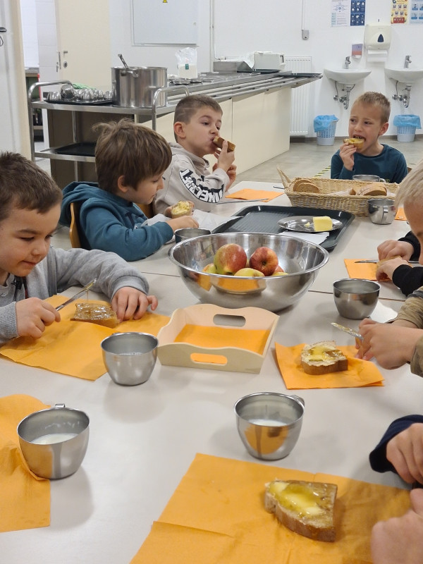 V popoldanskih dejavnostih so učenci pripravili pano, na katerem so ponazorili pomen lokalnih živil, ter se pogovarjali o tem, zakaj je pomembno, da jemo zdravo in domače pridelano hrano. V petek zjutraj smo se vsi zbrali v jedilnici in uživali ob zares tradicionalnem zajtrku: mleku, maslu, medu, kruhu in jabolkih. Vzdušje je bilo prijetno, skupni obrok pa je učencem pričaral lep začetek dneva.