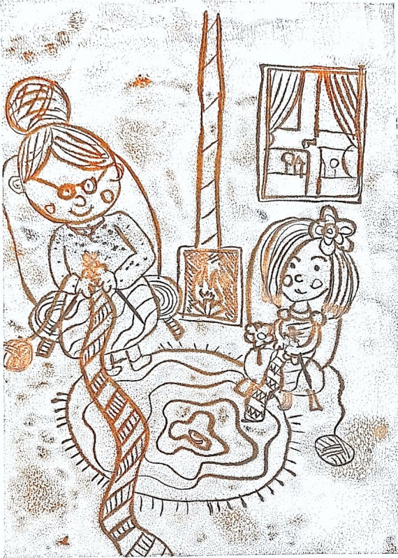 Veseli smo, da je med njimi tudi naša Elena, ki je uspela prepričati strokovno komisijo s svojo monotipijo z naslovom »Pletenje z babico«. S svojo umetniško stvaritvijo se je uvrstila na mednarodno razstavo v Koroški galeriji likovnih umetnosti Slovenj Gradec.