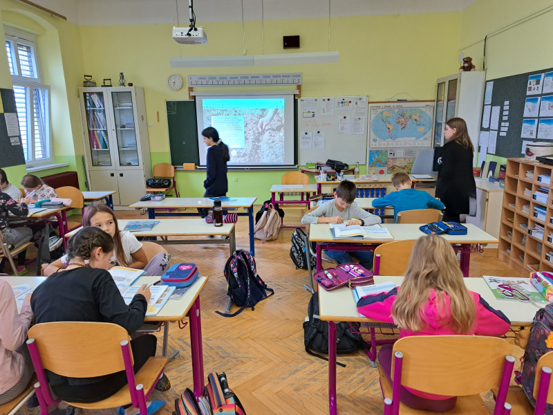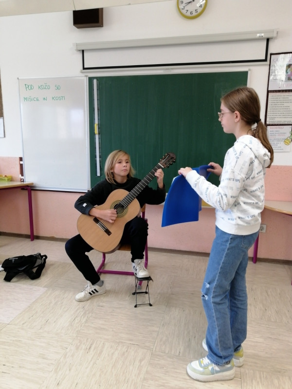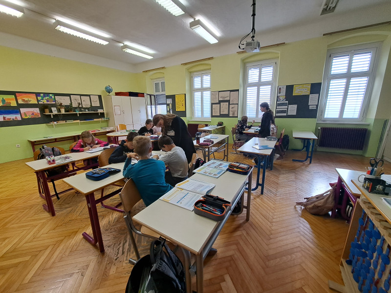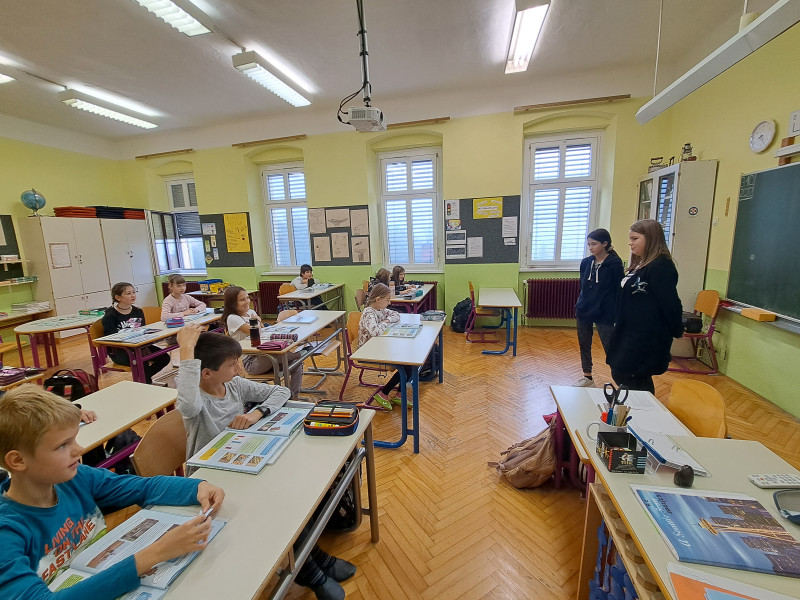 Danes so starejši učenci prvo šolsko uro prevzeli mesto učiteljev v večini razredov na podružnici. Za eno uro so postali učitelji mlajšim učencem. Sedmošolci Rok, Živa, Ema, Anja in Julija so se na poučevanje skrbno pripravili. Uro angleščine pa sta petošolca Hana in Nejc suvereno izpeljala v drugem razredu.