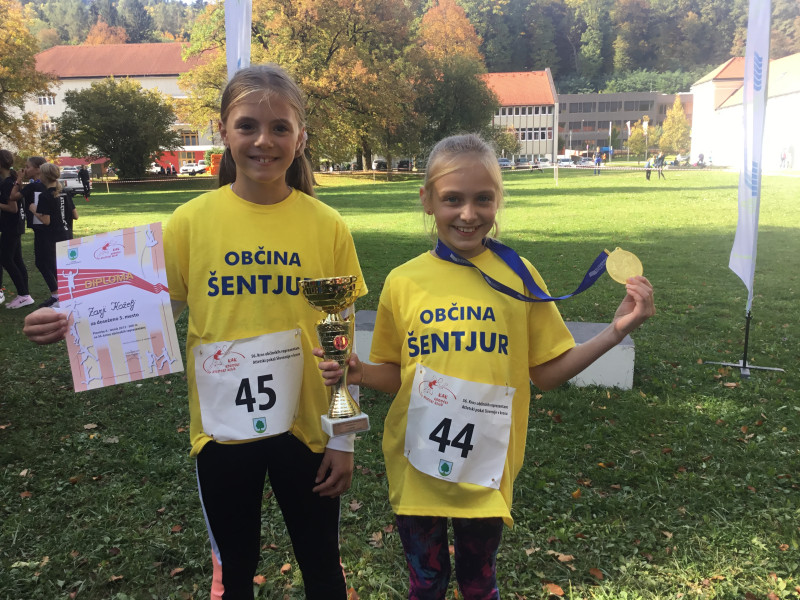 Na Ravnah na Koroškem je danes, 8. 10. 2022, potekal 56. kros občinskih reprezentanc, na katerem je sodelovala tudi občina Šentjur. Naša petošolka Tinkara Gajšek, ki se je z uspešnim dosežkom na šolskem medobčinskem krosu uvrstila med današnje tekmovalce in s tem zastopala našo občino, je v kategoriji petošolk dosegla prvo mesto. Tinkari, ki je prejela zlato medaljo ter pokal, iskreno čestitamo in ji želimo še naprej »hitre nogice« 😉.