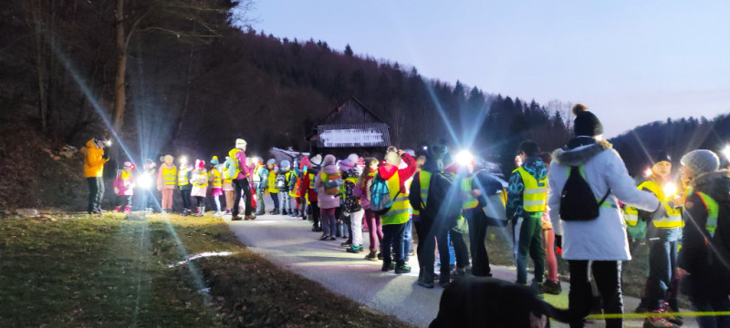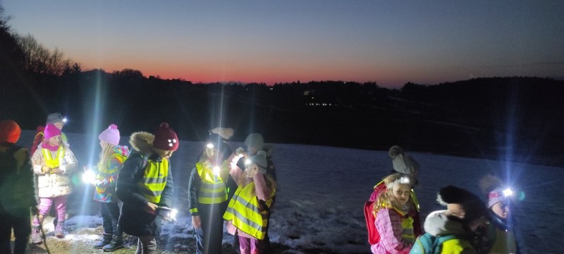 V petek, 10. 2. 2023, smo se učiteljice, mentorice planinskega krožka z učenci OŠ Franja Malgaja in podružnice Blagovna, odpravile na nočni pohod po obronkih Šentjurja. Kar 48 učencev, od tega 19 Blagovčanov, članov planinskega krožka, se je z lučkami, odsevnimi brezrokavniki ter kresničkami podalo na raziskovanje snežnih kristalčkov in iskanje gozdnih škratov, ki smo jih spretno odganjali z našo razigranostjo in smehom. Proti koncu našega nočnega pohoda pa nas je s toplim čajem in slastnimi piškoti razveselila kuharica Polona.