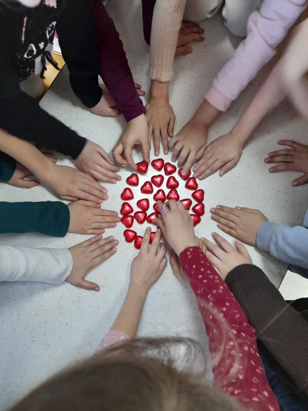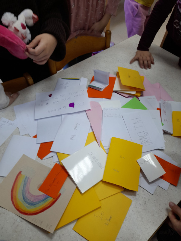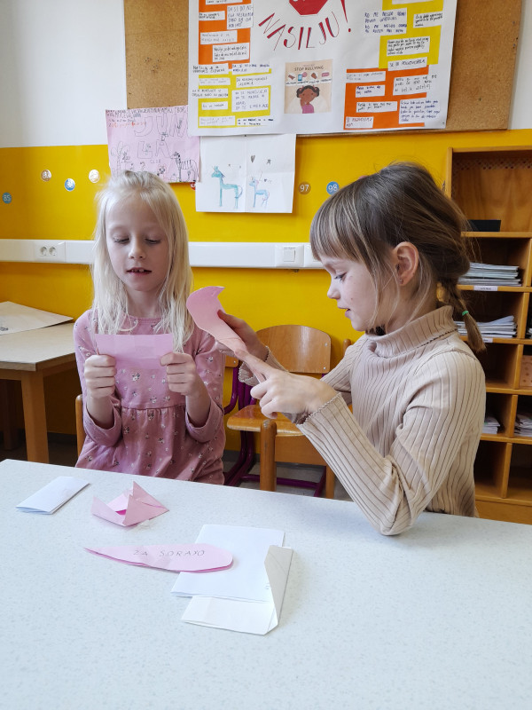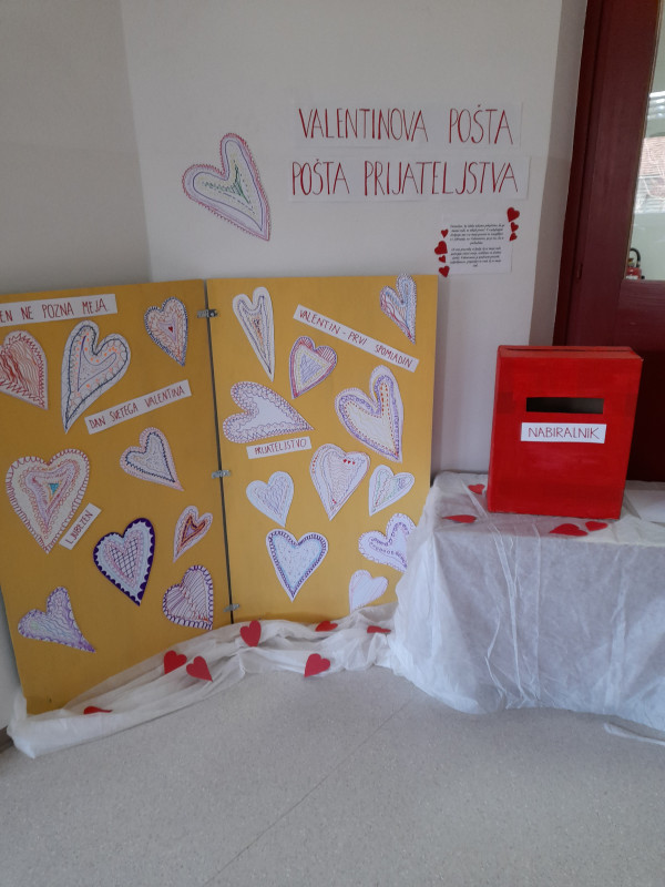 Tudi na šoli smo obeležili Valentinovo. Teden dni prej smo v garderobi postavili Valentinov kotiček, ki je bil namenjen vsem malim in velikim zaljubljencem oziroma vsem, ki so želeli kaj lepega sporočiti svojim simpatijam, prijateljem, sošolcem, ali učiteljicam. Na tem prostoru se je zbirala Valentinova pošta. V poštnem nabiralniku se je kmalu nabralo ogromno sporočil, ki so jih mladi pismonoše raznosili po razredih in tako razveselili ter polepšali dan marsikateremu učencu, učenki in tudi učiteljici.