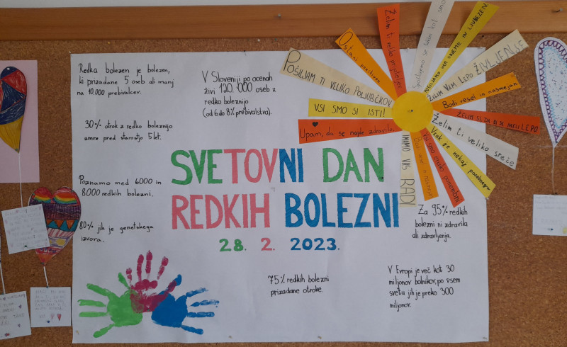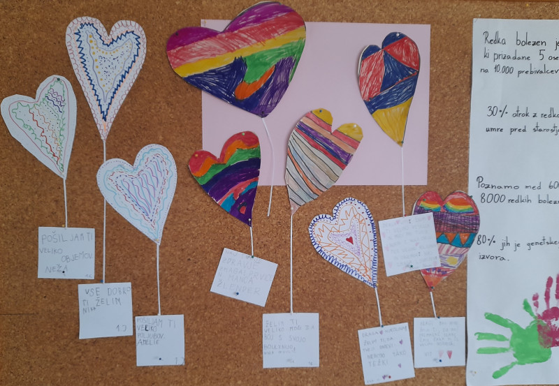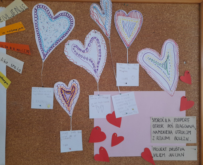 Danes je svetovni dan redkih bolezni, zato smo se na šoli odzvali na povabilo k sodelovanju v projektu »Srčna pisma za male borce«, ki poteka pod okriljem  Društva Viljem Julijan.  Za male borce, katerih videne zgodbe so se močno dotaknile naših src, smo izdelali srčna pisma –  sporočila podpore, solidarnosti, sočutja in ljubezni.  Vse skupaj smo razstavili v garderobi ter tako pokazali, da nam je mar.
