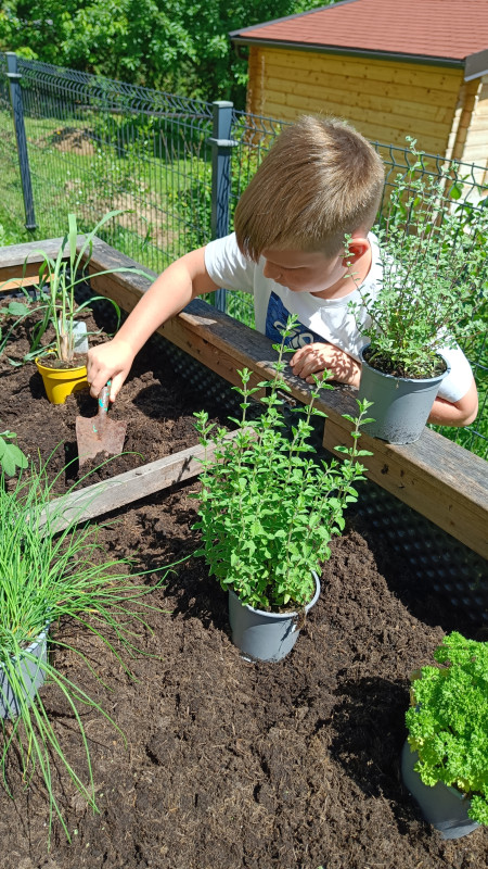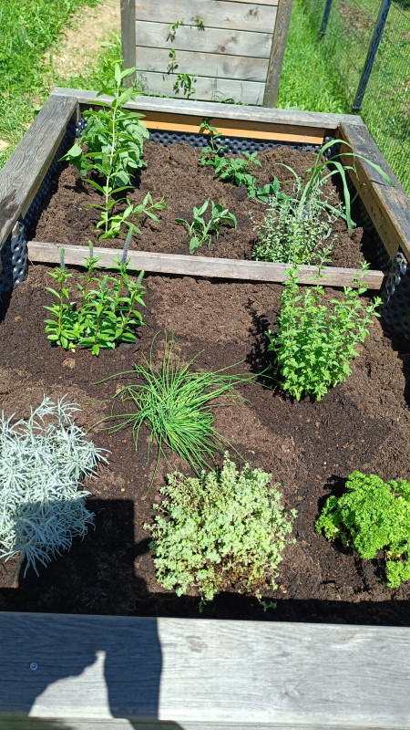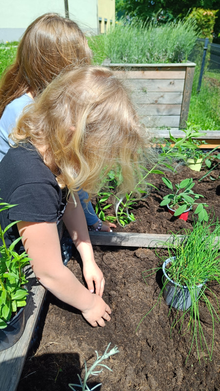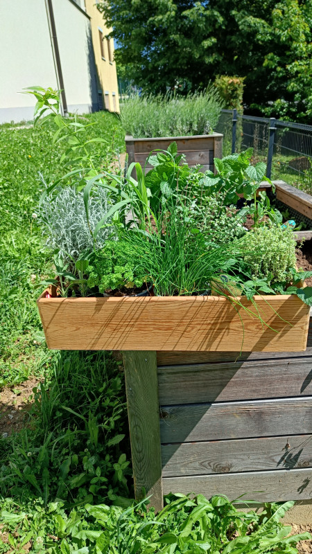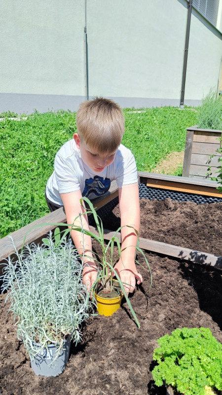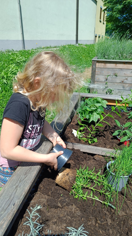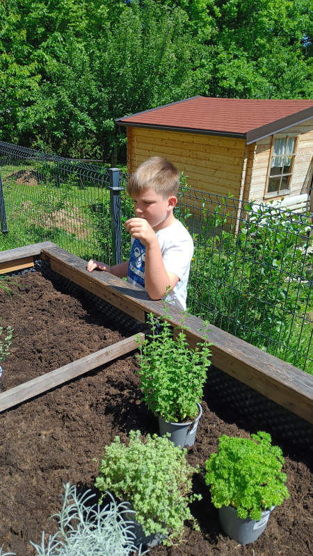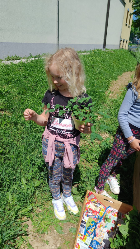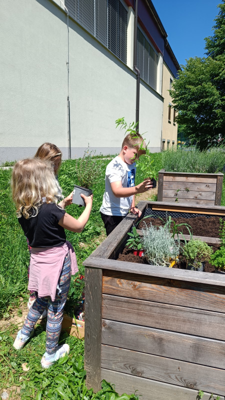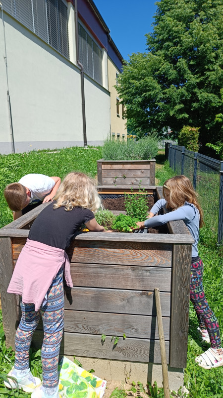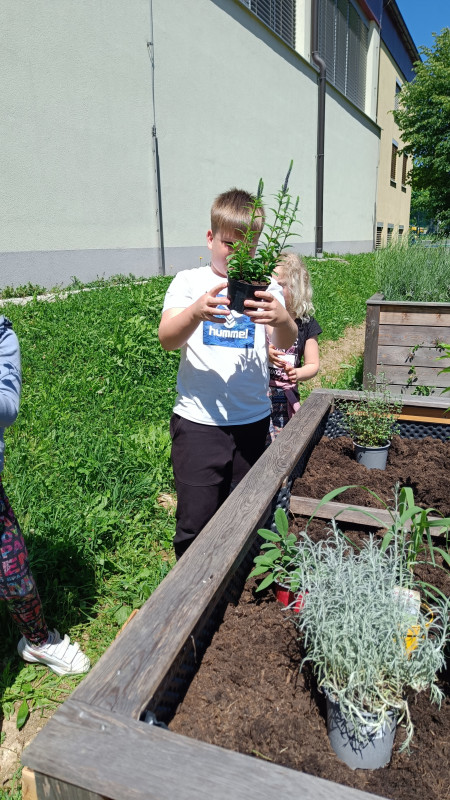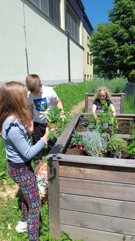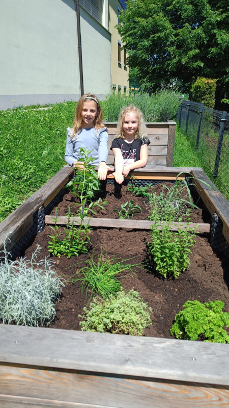 Zato smo letos obnovili eno od šolskih visokih gred in vanjo posadili zelišča, ki jih bomo uporabljali kot začimbe, sladila, čaje in dodatke zdravim malicam.