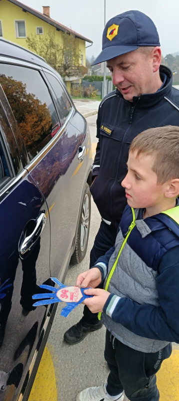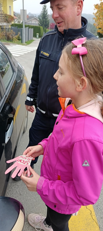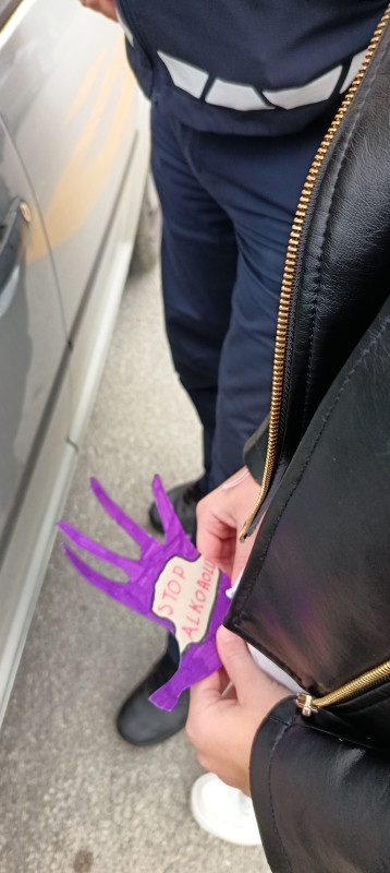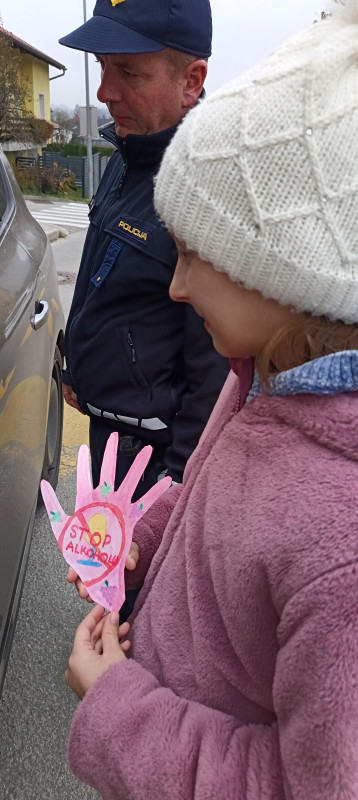 Učenci OPB smo se pridružili akciji STOP ALKOHOLU, ki ga že nekaj let organizira NIJZ. V šoli smo se pogovarjali o učinkih alkohola na možgane in o delovanju telesa pod vplivom alkohola. Ob pogovoru smo našli tudi veliko možnosti, kako se po pitju alkohola izogniti vožnji z avtomobilom. Izdelali smo papirnate dlani, ki smo jih okrasili s slikami. Drugo stran dlani pa smo opremili z napisom STOP ALKOHOLU. Za pomoč pri izvedbi akcije smo zaprosili policiste šentjurske policijske postaje. Policista sta ustavljala mimovozeče avtomobile, učenci pa smo jim predali papirnate dlani z opozorilom. Za praktično izvedbo sta v veliki meri zaslužna policista M. Fuchs in S. Vodušek, za kar se jima učenci in učiteljice iskreno zahvaljujemo.