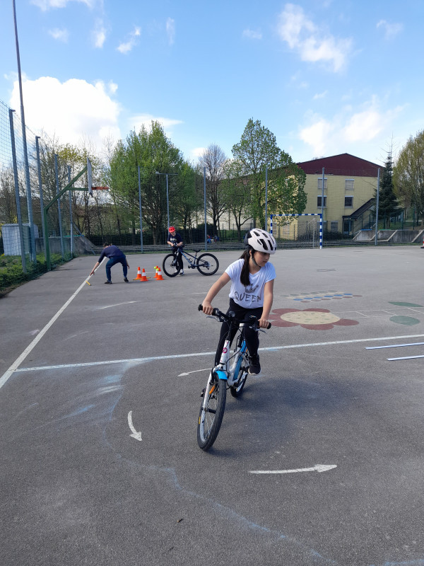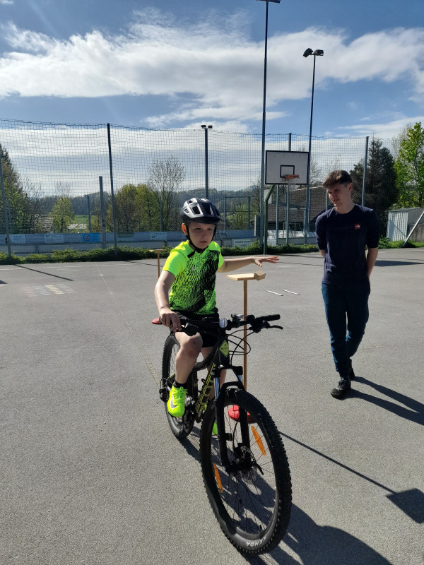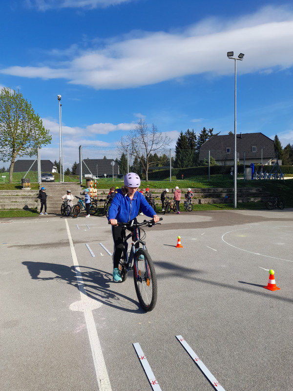 Še prej pa je policist Miran pregledal kolesa in jim dodelil nalepko Varno kolo. Učenci so se z navdušenjem urili na poligonu in tako razvijali spretnost vožnje s kolesom.  Po urah vadbe so vsi uspešno opravili ta praktični del izpita.