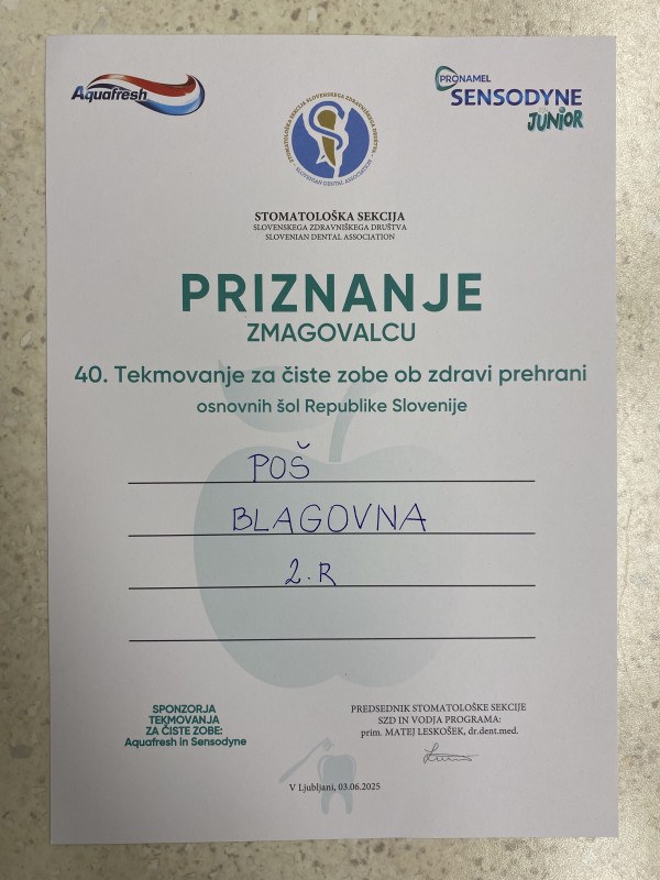 Učenci drugega razreda so znova dokazali, da skrb za zdravje pomeni tudi skrb za lepe in čiste zobke. S svojo zagnanostjo in vsakodnevnim vestnim umivanjem zob so osvojili prvo mesto v tekmovanju za čiste zobke, ki spodbuja otroke k ustni higieni.