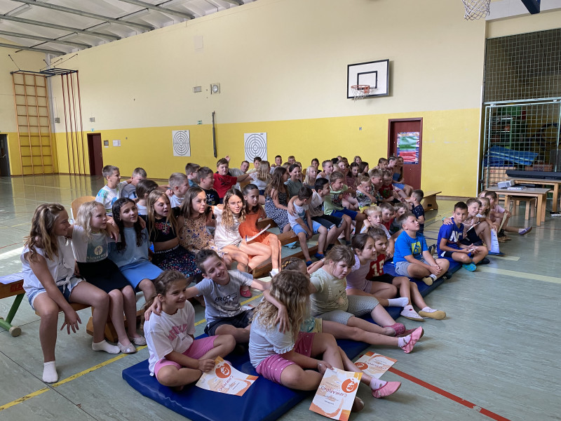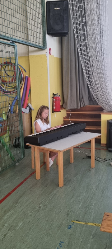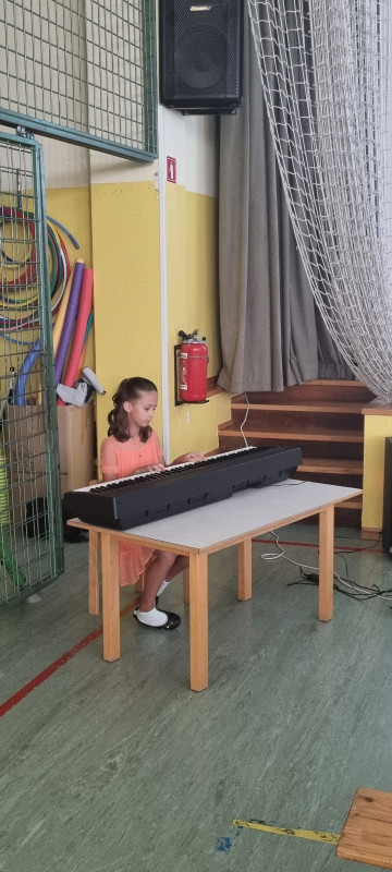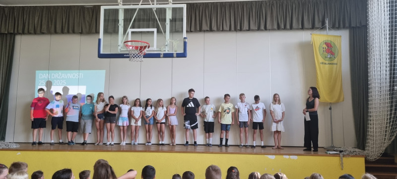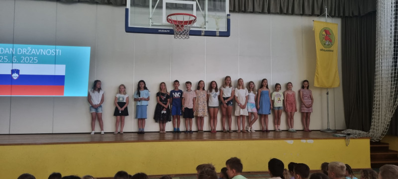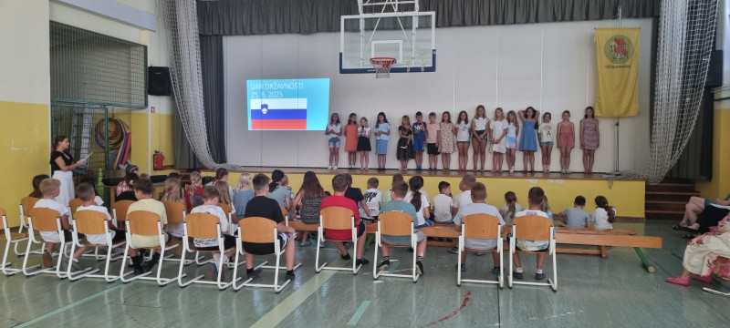 Na zadnji šolski dan, 24. junija 2025, smo v šolski telovadnici pripravili prireditev ob dnevu državnosti. Program je potekal s sodelovanjem šolskega pevskega zbora, za prijetno glasbeno spremljavo pa sta poskrbeli učenki z igranjem na klavir. Prireditev so soustvarjali tudi napovedovalci, ki so povezovali posamezne točke in poskrbeli za tekoč potek dogodka.