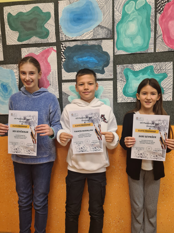 S ponosom sporočamo, da so naši petošolci Sara Sevnšek, Mia Sevčnikar in Tibor Hudoklin na 19. medobčinski otroški likovni koloniji »Planina 2025« osvojili najvišje priznanje – zlato priznanje za svoja likovna dela.