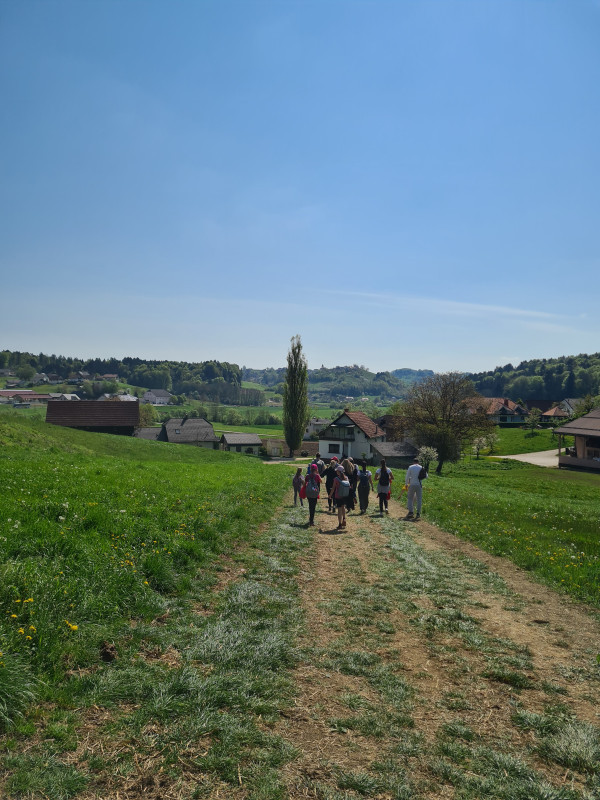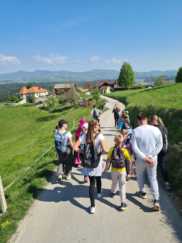 Zbrali smo se v Šentjurju in se skupaj z ostalimi pohodniki odpravili na pot.  Ker nas je spremljalo čudovito sončno pomladno vreme, se je letos pohoda udeležilo tudi zelo veliko staršev. Z njimi je bila hoja še toliko prijetnejša. Med potjo smo se pogovarjali in uživali v naravi.